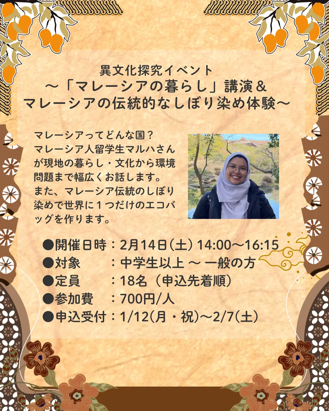 マレーシア人留学生マルハさんが現地の暮らし・文化から環境問題まで幅広くお話します。